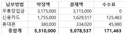 홈리스 월동프로젝트> 모금 목표액은 7,000,000원으로 설정하였고, 총 모금 약정액은 5,310,000원, 실제 결제액은 5,078,537원으로 목표액 대비 72.6%를 달성하였습니다. 목표에 온전히 도달하지는 못했으나 한 달에 불과한 짧은 기간에 많은 분들이 마음을 모아 주심에 감사합니다. 구체 수입 내역은 다음과 같습니다.